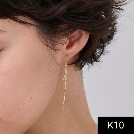 耳たぶの前後でデザインチェーンが揺れる、まるでピアスのような見た目のK10イヤリング