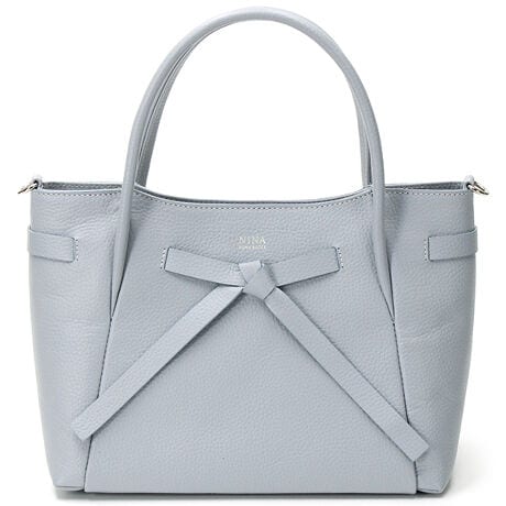 ニナ・ニナ リッチの結んだ切りっぱなしのボウタイがポイントの2WAYバッグです。柔らかく仕上げた型押しのシュリンクレザーを使用し、二つに折った手紐は肩にかけた時に重さを感じにくい仕様です。フェミニンですが甘すぎないデザインで、通勤から休日のオフスタイルまで幅広く使えます。