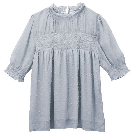 透け感のあるドットドビー素材のフリル衿と胸元に入ったギャザーが大人フェミニンなデザイン。