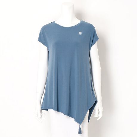 水陸両用で伸びる素材のヨガトップス。動きに合わせて揺れるフリンジのワンポイントが付いた、変形ヘムのデザインがかわいらしい一枚。丈は長めでヒップが隠れ、リラックスした雰囲気に。吸水速乾機能あり。水に濡れてもOKですので、ホットヨガにもオススメします。ヨガはもちろん、水着のカバーアップやあらゆるスポーツ用トップスとしてお使いください。