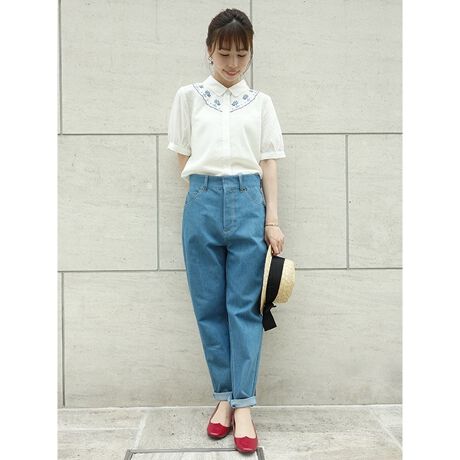ガーリーなアイテムとのコーディネートにぴったりのテーパードデニムパンツ。