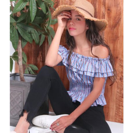 ストライプ+シャーリングがスタイルアップしてくれるオフショル。