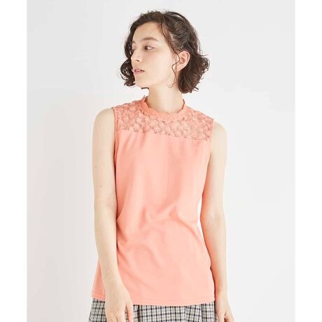 胸元にレース切り替えのあるノースリーブカットソーは、フラワーモチーフの可愛らしい刺繍にスカラップのスタンドカラーが顔周りを華やかに演出してくれます。