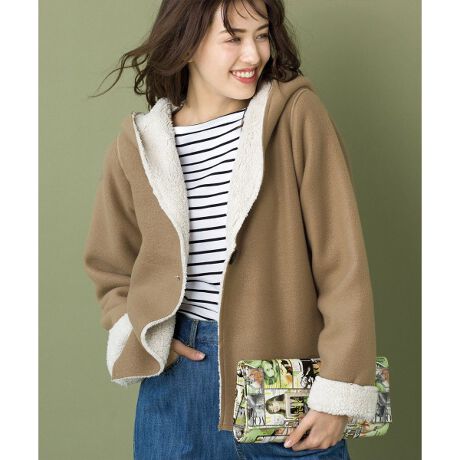 表側はウールライクな素材感、裏側はボアの温かみえ。