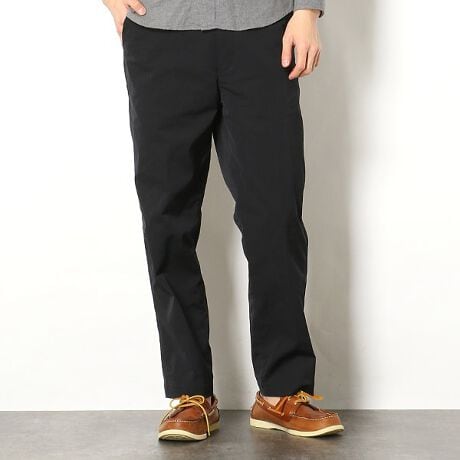 アウトドアを楽しむための機能を、日常的なボトムに。ポリエステル100%素材ながらコットンのようなナチュラルな風合いで、しなやかなストレッチ性を備えたチノパンツです。撥水性があるため、多少の雨なら対応でき、汚れがつきにくいのも魅力。さらに、雨濡れや洗濯後も乾きやすくイージーケアです。やや太めのシルエットや後ろの両玉縁ポケットといった、スタンダードなチノパンツのディテールにこだわったデザイン。ベルトループ付きのウエストやロールアップしやすい裾のサイズ感など、定番の1本として使いやすく仕上げています。