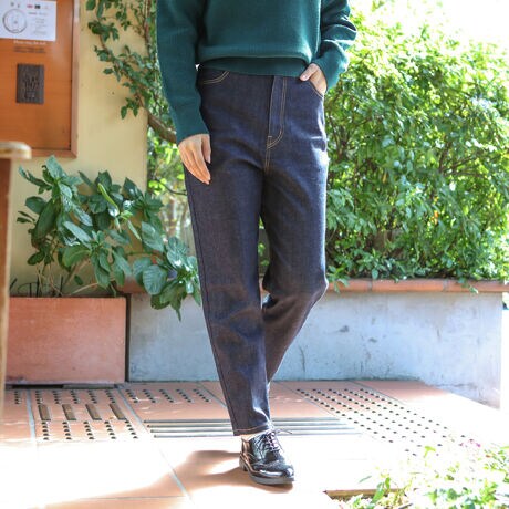 脇にあえて丸みを出すラインにすることで女性らしいシルエットに仕上げています。また、履き込み位置をジャストウエストにすることで、脚長効果も期待できます。丈をくるぶしが覗くアンクル丈にすることで、抜け感がでて軽い仕上がりになり、足首もきれいに見せてくれます。