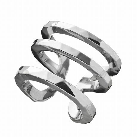 レディースジュエリーブランド「Elenore Jewelry エレノアジュエリー」とのコラボレーションリング。刻印もWネームで打刻されます。デザインは3連リングでお洒落に重ね着けしているように見えるカフ式フリーサイズリング。重ね着けの感じも、少し距離をおいて空間を生かしたデザイン。ワイドながらシャープに見えるシルエットで指が美しく見えます。リング幅2種のシンプル平打ち槌目リングデザイン。同じデザインで、メンズとレディースサイズがあり、ペアでもオススメ。モードでスタイリッシュなデザインはシンプルで様々な服装に合わせやすい大人なデザイン。光沢ある銀の質感を生かした、銀のきらめきを堪能出来る逸品です。ロジウムメッキ仕様で変色しにくいのも利点です。