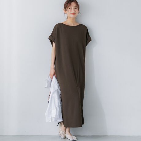 ロールアップした袖がカジュアルな雰囲気に仕上げてくれるエンボスワンピース
