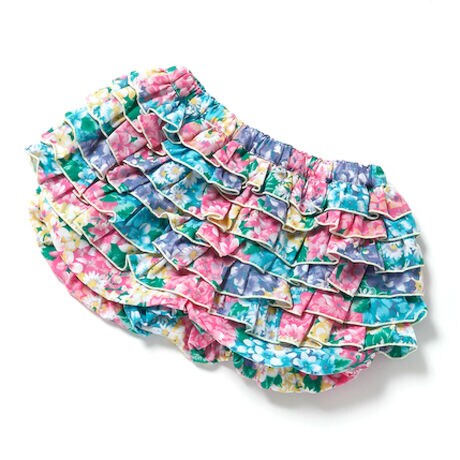 カラフルにあじさいが咲き誇った人気テキスタイルのフリルブルマーは一枚ではもちろん、ワンピースの下に履いてちらりと見せてもとってもキュート☆一年を通して活用して頂けるアイテムなので、ご自宅用はもちろん出産祝いとしてもおすすめです。トップスやビブ、ソックスなどとコーディネートして素敵なベビーギフトに♪