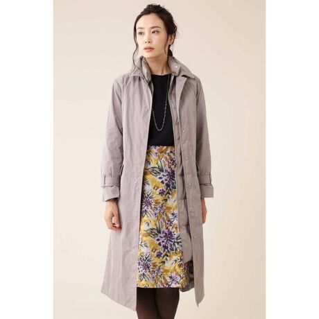 比翼のステンカラーは少しゆったり目のサイズ感。袖ベルトは調節を絞める事でラッフル袖にすることが出来ます。ポケットに雨が入らないようにフラップポケットにしています。インナーライナーは粒わたを使用し、ダウンのようなソフトな感触ですがダウンとは異なり、空気層がつぶれることなく、保温性をキープできる化繊わたを使用しています。ステッチの幅をウエストに向かって細くすることでスタイルの細見え効果を可能にしてくれます。