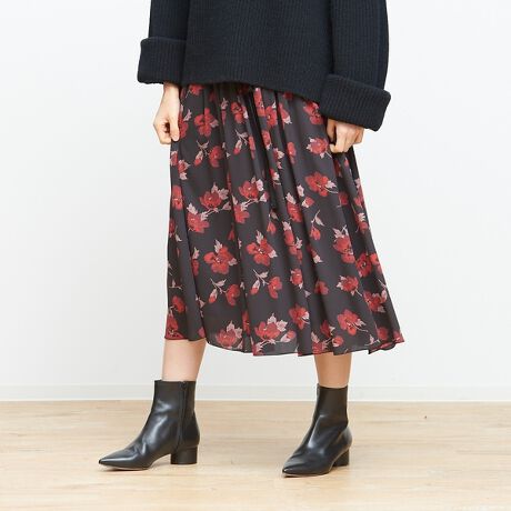 パッと目を引くオリジナル柄のプリントがドラマチックな印象のフレアスカート。