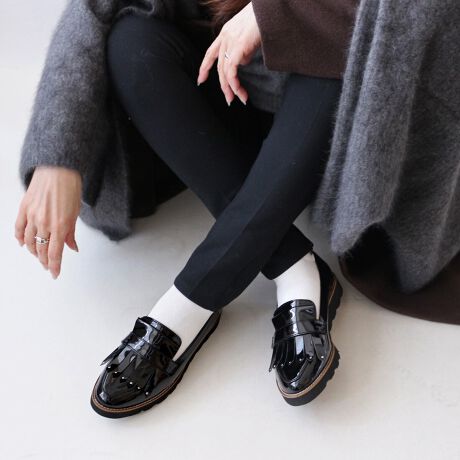 中敷きの下には低反発クッションをセットしているので足裏にも優しく、返りの良いソールなので長時間の歩行でも安心して履けそうです。エナメル素材を使用しているカラーは足元に程よい艶感をプラスするだけではなく、多少の雨の日にも使えるのが嬉しいポイント。どんなコーデにもすんなり馴染むので、デニムやワイドパンツはもちろんスカートスタイルの外しアイテムとしても活躍しそう。シーズンレスで使えてマストなローファーをいち早くGETして。