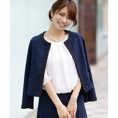 ぱっと見ツイードのように見えるカットソー生地をグログランプリーツで縁取ったジャケット。