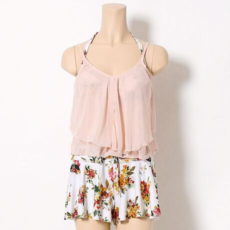 パステルカラーのシフォンが女の子らしく、2段フリルでしっかり体型カバーのできるキャミソール付き4点セット。2段のフリルは垂らしたままだと大人っぽく、1段目を結ぶと可愛らしく、2パターンの着方を楽しめます。中身のビキニはトレンドのあじさい柄です。TOPS脇は調節可能。様々な大きさの胸に対応できます。パンツのウエストは1周ループが通っているので自由に調節できます。股上深め、丈長めのフレアーパンツでヒップと太ももをしっかりカバー。お腹までしっかり隠れるキャミソールで体型をカバーできます。