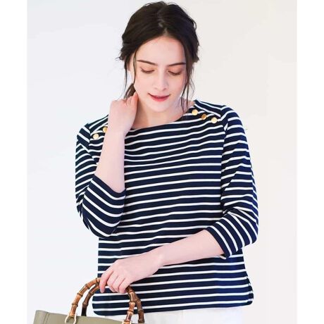 マリンを感じさせるボタンデザインがポイントのボーダーカットソー。 生地の表面がなめらかでハリがあり、上質な印象を持つポンチ素材を使用。 肩のボタンは開閉できるので着脱が楽々! ベーシックな着丈でボトムも幅広く合わせられる、春に便利なアイテムです。