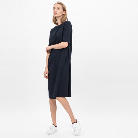 カッチリとしたシックな風合いながら、ストレッチ性にも優れたポンチ素材を採用。ウエストから裾にかけて配された斜めスラッシュのレイヤードデザインで、女性らしい動きのある表情の中にもシャープでスマートなニュアンスを表現したワンピースドレスです。極力装飾を削ぎ落としたミニマルデザインで、あらゆるスタイルに対応する万能な1枚に。