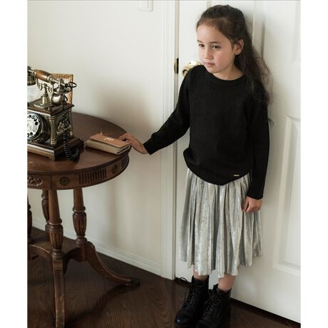 エレガントなプリーツの揺れと、クラッシュベロアのユニークな艶感で、大人も顔負けの特別な一着に。