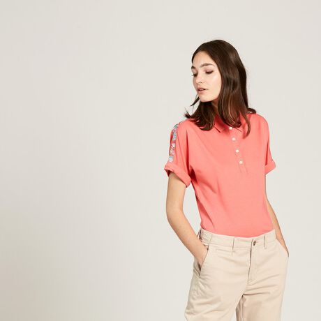 コットンとレーヨンのブレンド素材を使用。カジュアルな風合いの中にエレガントなタッチ感を兼ね備えた、AIGLEらしい素材感が印象的な1枚です。ショルダーラインと下前立ては、LIBERTY?プリントファブリックで切り替えに。英国伝統のフラワー柄で、春夏のレディーススタイルをフェミニンに彩ります。ロールアップスリーブもポイント。