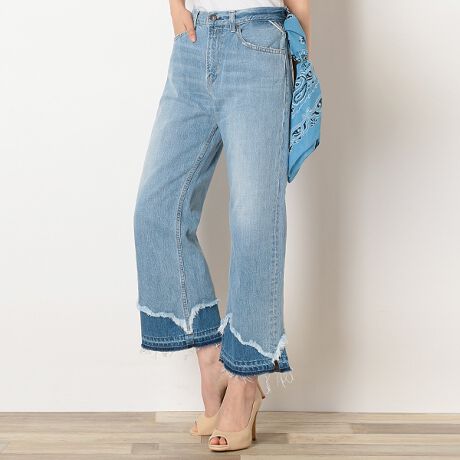 クロスハッチと呼ばれる網目のように交差状につけた研磨でグレイッシュな風合いに仕上げ、3Dの樹脂洗浄でシワを形成、そして所々に強いサンドペーパーとブラッシングでひげを立たせ、ライトブルーのUSED感が特徴。【AGATHE(アガサ)】ハイウエスト、ジップフライの5ポケットジーンズ。クロップド丈のワイドフィットで裾はアシメトリーなダメージ&別布でつぎはぎされたスリット入りのデザインです。ヘム24cm