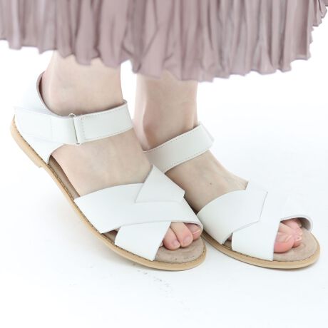 サンドレスやキャミワンピなどに合せてリゾーティーに、ベーシックなデニム合せでカジュアルにと幅広いコーデに対応。歩きやすいネイルが映えるヌーディーなクロスデザインが程よい女性らしさをプラスしてくれます。