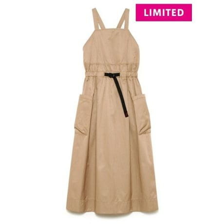 GRAMICCIのウェビングベルトをアクセントに、ギャザー使いやシルエットでemmiらしくタウン仕様に落とし込みました。