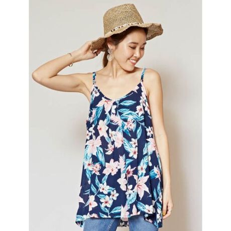 リゾート感あふれる爽やかなハワイアン柄キャミソール。軽やかなレーヨンクレープ素材で、夏でも涼やかに着られます。