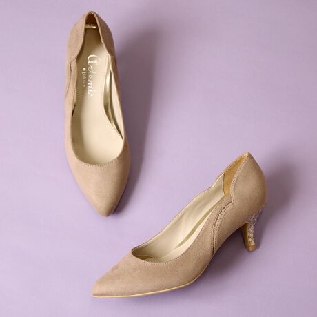 シャープすぎないポインテッドラインが柔らかな印象のグリッターヒールパンプス。