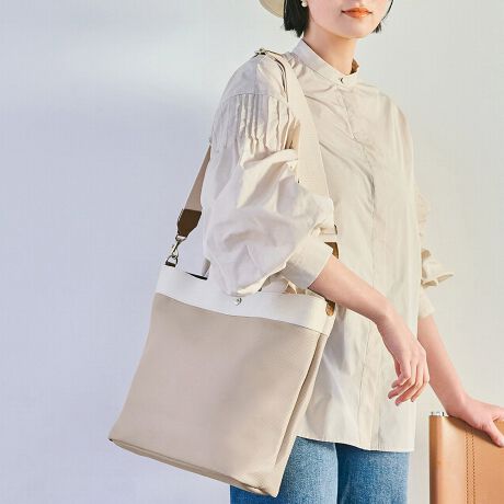 トレンドの縦長シルエットに、メンズライクな太めのショルダーを付けたハンサムなトート。ラフすぎず上品な印象に着地させるのは、RIPPLEならではのスマートな素材感と、ワンポイントに効かせたメタルのクリスプのアクセント。A4の書類やタブレット端末などがストレスなく収まり、使い勝手のいいサイジングも魅力。スナップで着脱可能なファスナーポーチ付きで、貴重品の持ち歩きも安心です。