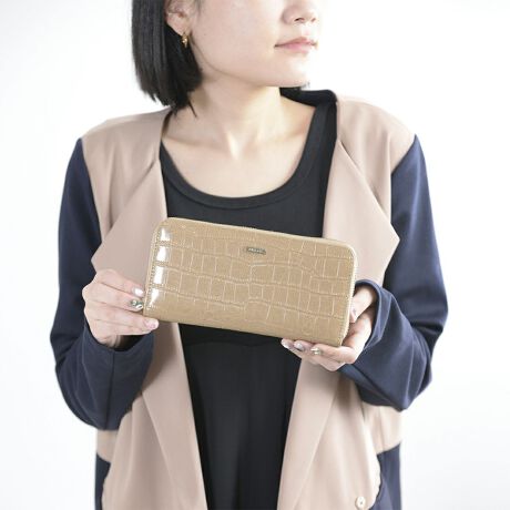 クロコダイルの型押しが高級感を感じさせる、使いやすいラウンドファスナー型の長財布です。