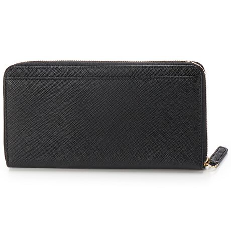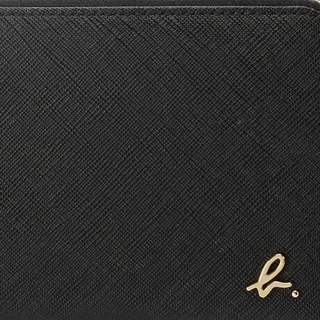 b.ロゴメタルがポイントのサフィアーノエンボスレザーを使用したラウンドジップロングウォレット。