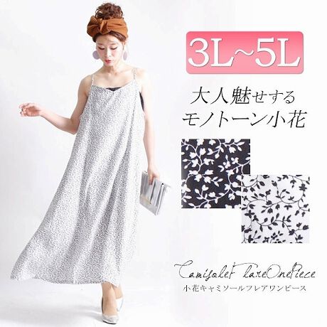 大きいサイズ レディース ワンピース チュニック マキシ キャミ 小花柄 調整紐 裏地 フレア