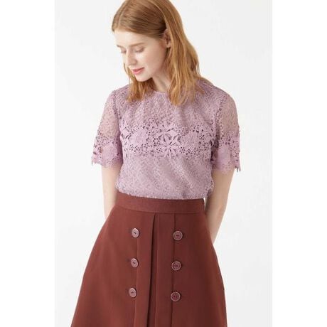涼しげなケミカルレースを使用したブラウス。程よく素肌をのぞかせる袖部分に加え、胸元と袖口のレース切り替えが印象的なデザインです。ウエストインでスカートやパンツ、アウトでパンツにも相性よく幅広いコーディネートに活躍します。女性らしさを醸すフェミニンなレースアイテムは、秋のムードを感じさせる新鮮なカラー展開も魅力です。