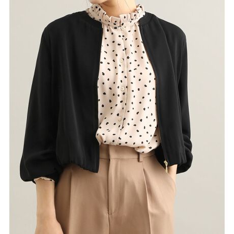 上品な光沢のあるポリエステルサテン生地を使用したジップアップブルゾン。
