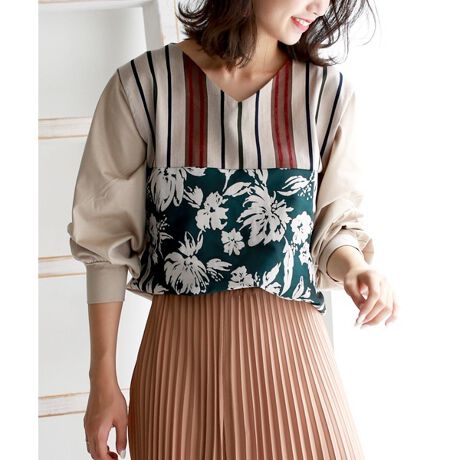 立体ストライプと大柄フラワーのジャガード織りが魅力のトップス。