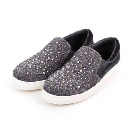 エンジェルソールの光沢感が上品な印象のベロア素材は伸縮性があり、足の形に柔軟に馴染み締め付け感が少ない軽い履き心地です。 スニーカーでも足元がキレイに見えるようにすっきりとしたシルエットにこだわりました。低反発クッションの中敷と軽量ソールで歩きやすさもUP。甲に施されたレースとストーンが足元を華やかな印象に。ボトムスを選ばす幅広いコーディネートにマッチする1足です。