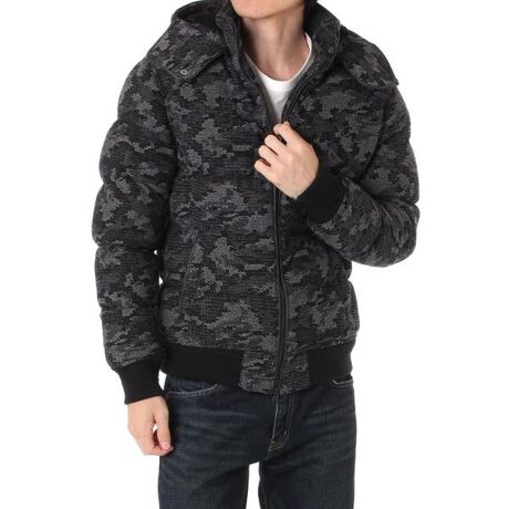 カモフラージュ柄を編み込んだニットでカジュアルさとクールさをミックスした中綿入りのブルゾン。着脱可能なフードで2WAYのアレンジを楽しめるのが魅力です。裾と袖口のリブ切り替えにより、外気をシャットアウト。フロントは体温調節やインナー見せに便利なダブルジップ仕様になっています。