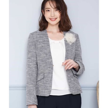 意匠感のあるツィード生地はストレッチがきいて着心地が良くスッキリ着用できるVネックジャケット。
