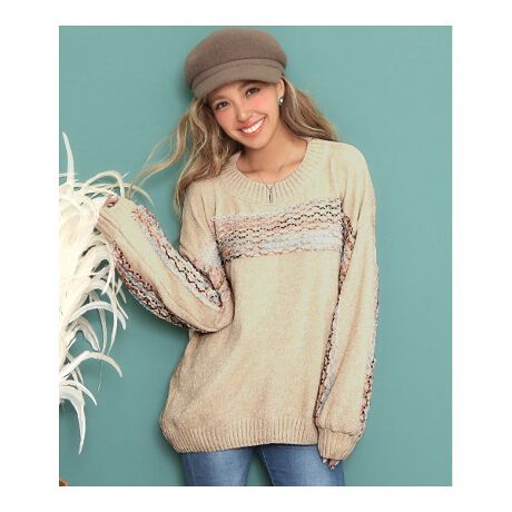 パステルステッチがアクセントになったベロアモールニットトップス。