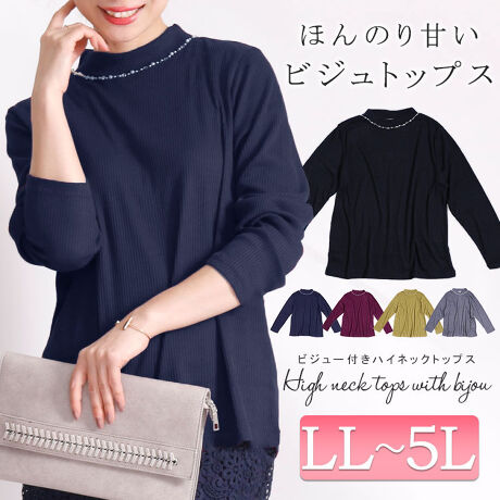 【大きいサイズ】レディース トップス ニット リブニット ビジュー 長袖 ストレッチ