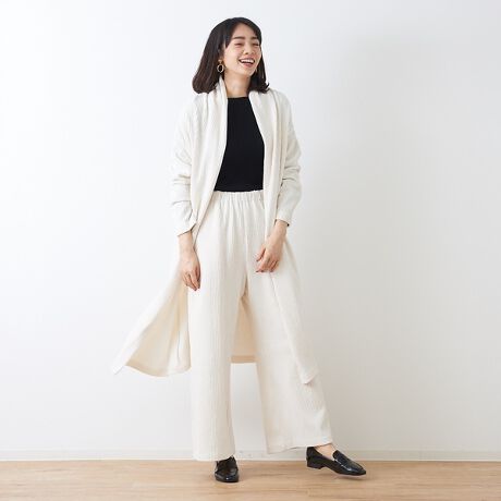 伸縮性のあるコーデュロイ素材のさっと織れるガウン。ロングスリーブでゆったりとしたシルエットは女性らしさをプラスします。