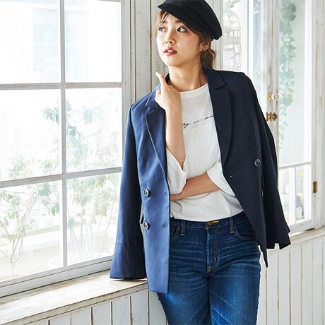 ダブルボタン&ボックスシルエットのテーラードジャケットは、1枚羽織ると今年らしいスタイルが決まるアイテム。