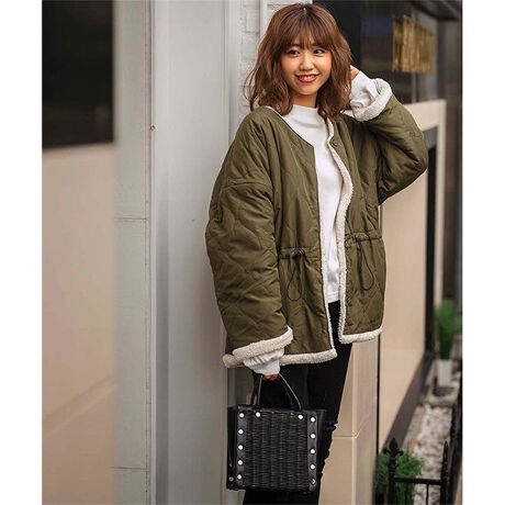 ノーカラーで上品&大人っぽく着こなせて、キルト面とボア面で表情が変わる、着回しが効くブルゾン。