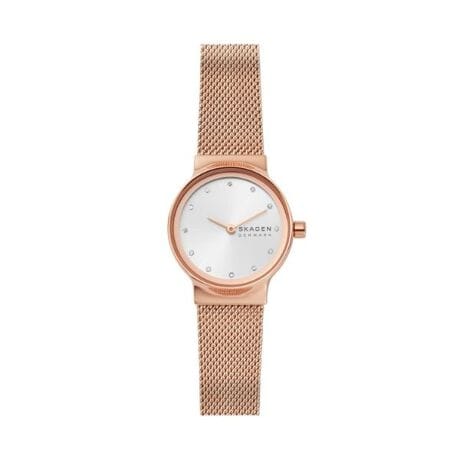 26mm径ケースに二針ムーブメントを搭載したFREJA LILLE。サンレイダイヤルにクリスタルのインデックスを配しました。12mm幅のスチールメッシュストラップが付いています。ウォッチストラップは付け替えできません。