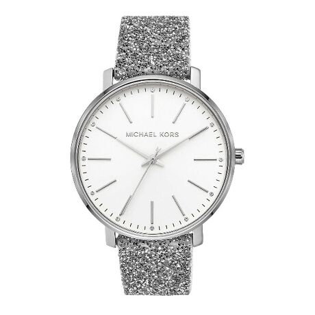 38mm径のケースに三針ムーブメントを搭載したMichael Kors PYPER。シルバートーンのバーインデックスを配したホワイトのサンレイダイヤルに、ホワイトのレザーストラップを組み合わせました。レザーストラップにはクリスタル装飾を施しています。