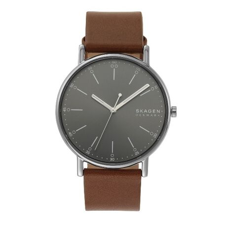 40mm径のケースに三針ムーブメントを搭載したSIGNATUR。グレーのサンレイダイヤルに、ブラウンのレザーストラップを組み合わせました。