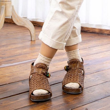 エスニックな雰囲気のアクセサリー付きストラップは、面テープですので脱ぎ履きもラクラクです♪さらにストラップの一部をゴムにしていますので、しっかり止めても足の動きに合わせてくれるので圧迫感を軽減♪少し厚底になっているので脚長効果も期待できます♪素足での着用も◎ですが、靴下コーデも楽しめますので、春から秋口まで長くお履きいただけます!