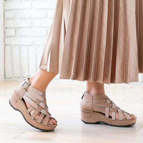Hinadaygreen人気の厚底ウエッジソール♪履くほどになじむ上質な本革を使用したサンダルです。オシャレ度が上がるレザーの編込み!かかとを覆うデザインなので、脱げにくいのもポイント!バックファスナー付きで脱ぎ履きも楽にできます!長時間履いても疲れにくい厚底ウェッジ◎。ゆったり履ける3Eタイプです。