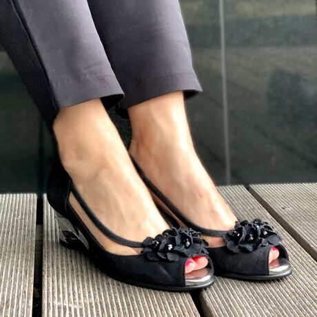 ステンドグラス柄のヒールは、新鮮な雰囲気のある春夏らしいオープントウパンプスに仕上がりました。