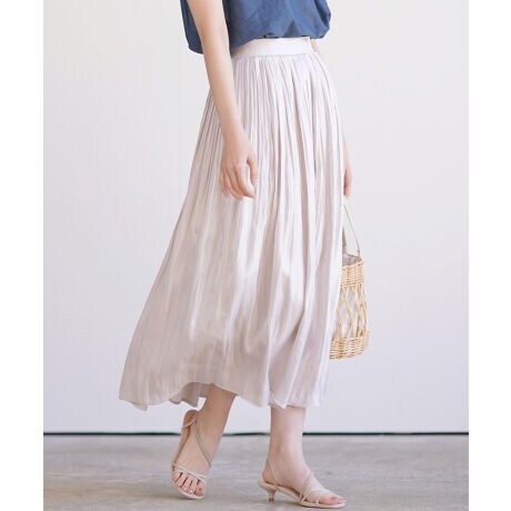 着こなしに華やぎを添えるシャイニースカート。シャイニーな輝きがスタイリングを盛り上げてくれるスカート。光に当たる角度で光沢が絶妙に変化するニュアンスたっぷりのサテン素材です。軽やかでふわりとしたシルエットが歩く度にひらひらと優雅な揺れ感を演出。ランダムな消しプリーツが広がり過ぎない大人っぽいデザインです。カジュアルからきれいめまで幅広くお使いいただけるアイテム♪ 裏地あり 伸縮性なし 薄手 ウエスト後ろゴム仕様 プリーツ加工(物理的に加工がしてあるため永久的なものではございません。お洗濯やご着用を繰り返すたびに伸びる場合もございます) 洗濯:手洗い可