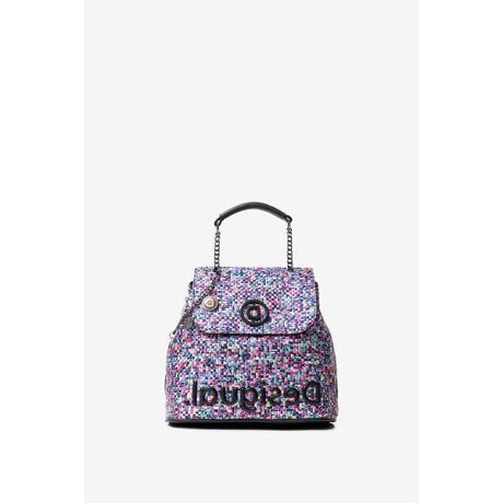 編み上げリュックサック、 Denver。マグネット開閉のフラップタイプで、さまざまなコインがぶら下がったチェーンが個性的な装飾を演出する。のベースにDesigual の新しいロゴが映えるデザイン。カラビナのディテールも見逃せないポイント。